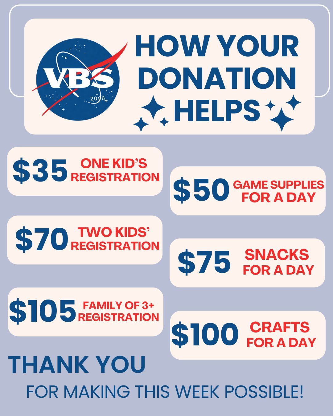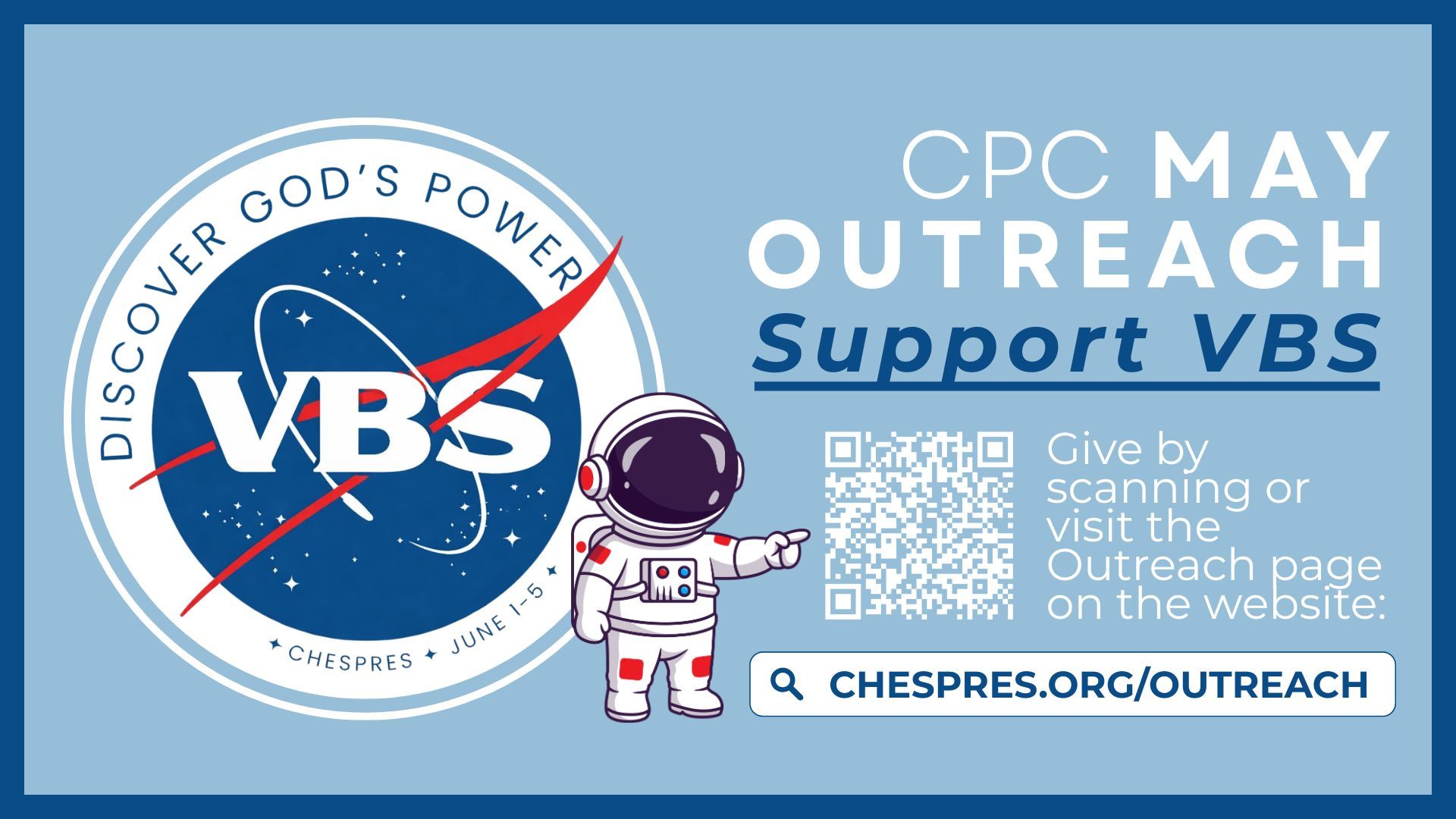 Throughout May, your donations will help purchase supplies for CPC's Vacation Bible School, "Discover God's Power," which will be held at the church the week of